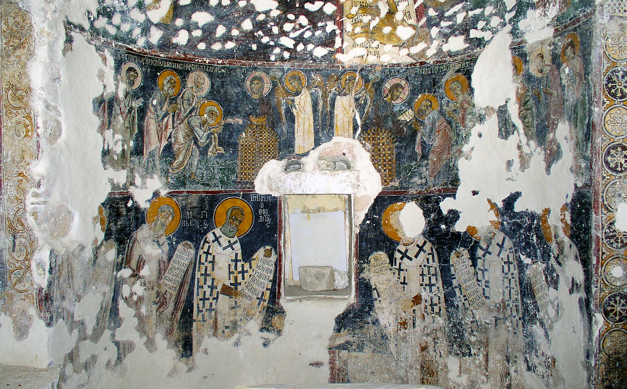 Ιδιαίτερης σημασίας αποτελεί το Α΄ στρώμα ζωγραφικής που αναπτύσσεται στον χώρο του ιερού της κεντρικής αψίδας και χρονολογείται στα τέλη του 12ου αι. Οι μορφές ακολουθούν την κομνήνεια παράδοση, ωστόσο γίνεται εμφανές το ενδιαφέρον για αύξηση του όγκου των μορφών σε σχέση με τα έργα της προηγούμενης περιόδου. Η τάση για ολοένα και φυσιοκρατικότερες αποδόσεις, που ξεφεύγουν από την αναζήτηση της υπερβατικότητας μέσω της απεικόνισης ιερατικού ύφους μορφών στην τέχνη της ανατολικής ρωμαϊκής αυτοκρατορίας αποτελεί μια από τις χαρακτηριστικές πρόδρομικες τάσεις που σταδιακά θα οδηγήσουν στην ιταλική Αναγέννηση.